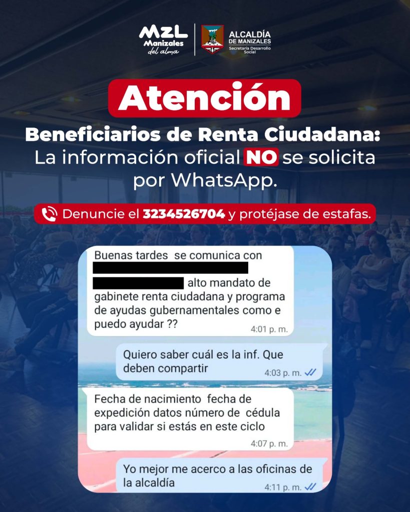 La Secretaría de Desarrollo Social de la Alcaldía de Manizales informa que se ha detectado una modalidad de fraude mediante la cual personas inescrupulosas están suplantando la identidad de esta dependencia, utilizando un número de teléfono y grupos de WhatsApp que anteriormente fueron canales de información institucional. Esta situación busca engañar a la ciudadanía afectando […]