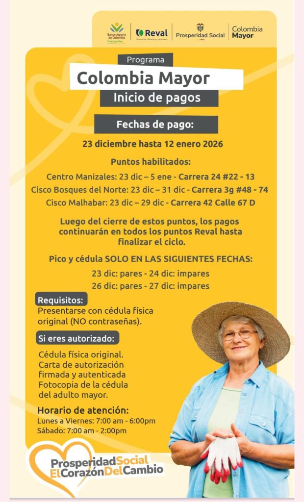 Pieza gráfica: contiene toda la información de los pagos de este ciclo La Secretaría de Desarrollo Social de Manizales informa que, de acuerdo con Prosperidad Social, a partir de este martes 23 de diciembre inicia el ciclo de pagos del programa Colombia Mayor, el cual se extenderá hasta el 12 de enero de 2026, con […]