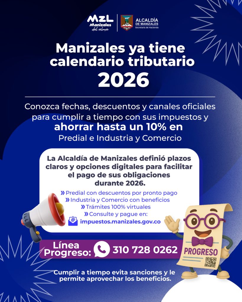 Diseño con información del calendario tributario 2026. La Alcaldía de Manizales, a través de la Secretaría de Hacienda, expidió la Resolución 280 del 11 de diciembre de 2025, que fija plazos, descuentos y canales para el cumplimiento de las obligaciones tributarias durante 2026. El objetivo es brindar reglas claras a los contribuyentes y facilitar el […]