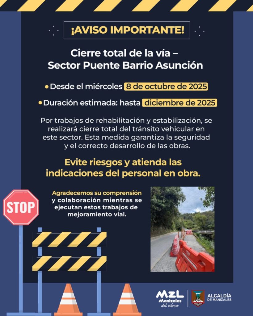 –La ejecución de esta importante obra cuenta con una inversión de $550 millones, una muestra del compromiso de la Administración Municipal por fortalecer la infraestructura y elevar la calidad de vida de la comunidad. – Una vez concluidas las labores estructurales principales, se habilitará un carril de tránsito controlado, el cual permanecerá en funcionamiento hasta […]