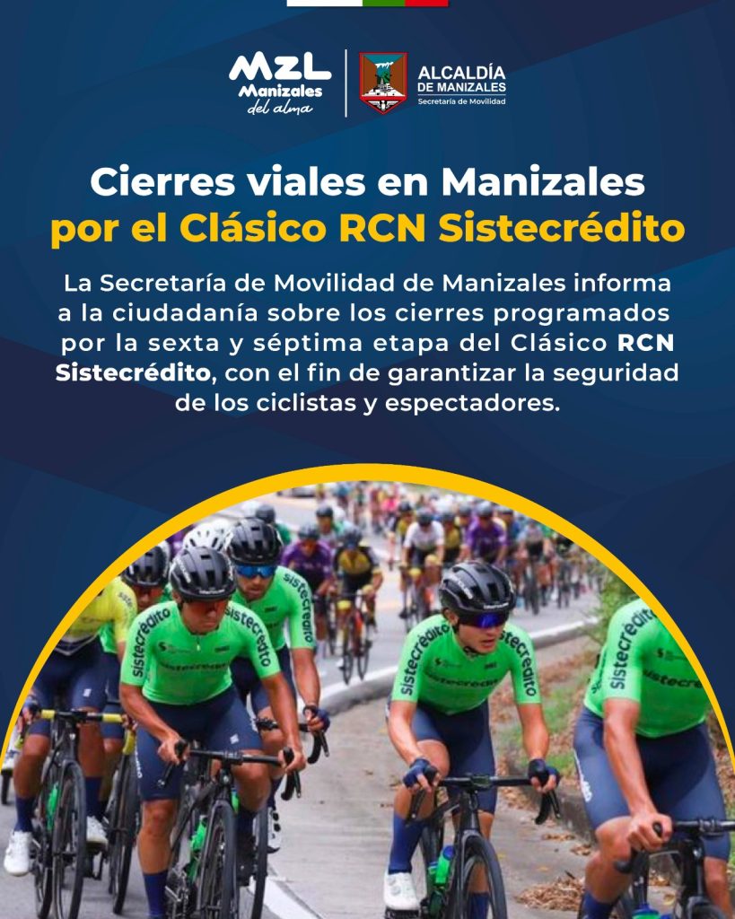 Imágenes: carrusel informativo con los cierres viales programados para la sexta y séptima etapas del Clásico RCN Sistecrédito en Manizales y Villamaría La ciudad será escenario esta semana del Clásico RCN Sistecrédito 2025, una de las pruebas ciclísticas más importantes del país, que tendrá paso por Manizales los días jueves 25 y viernes 26 de […]